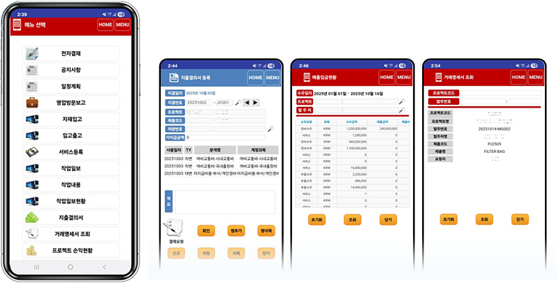 자재 입고, 작업일보, 지출결의서 등록/조회